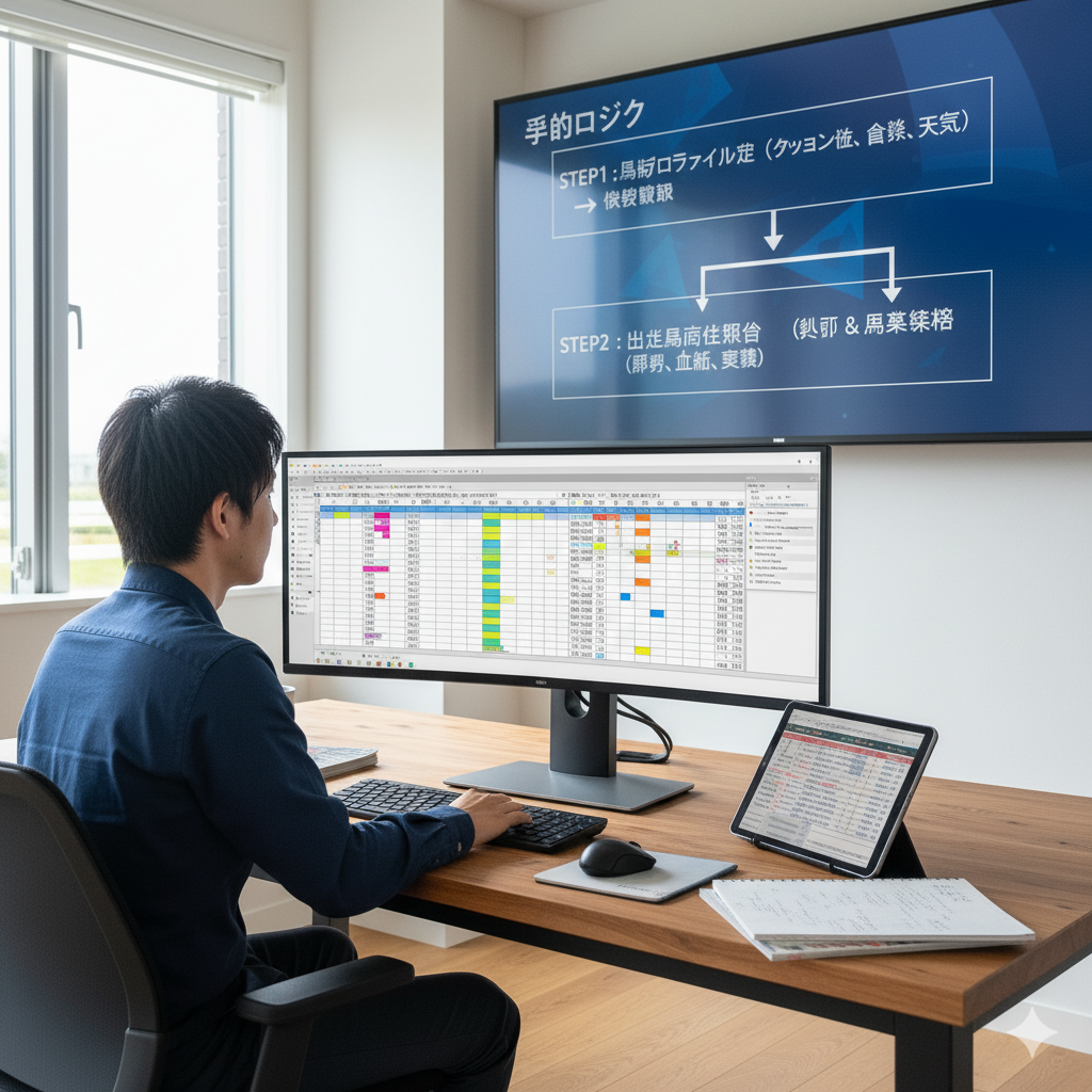 ステップ1で定義した馬場プロファイルに、脚質、血統、過去の実績という3つの観点から最も合致する馬が、その日の本命馬(◎)の最右翼となります。例えば、「仮説A(高速・前残り)の馬場」において、「先行力のあるロードカナロア産駒」で、なおかつ「高速馬場での勝利実績を持つ馬」がいれば、それは絶好の狙い目と判断できるわけです。